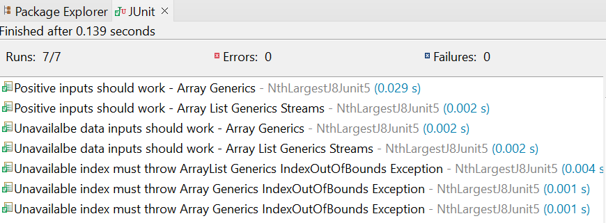 This is the JUnit 5 solution to cover all kinds of inputs provided to find the nth Largest number function. This Unit test executes tests for the ‘nthLargest’ function available in the class ‘NthLargestJ8’.